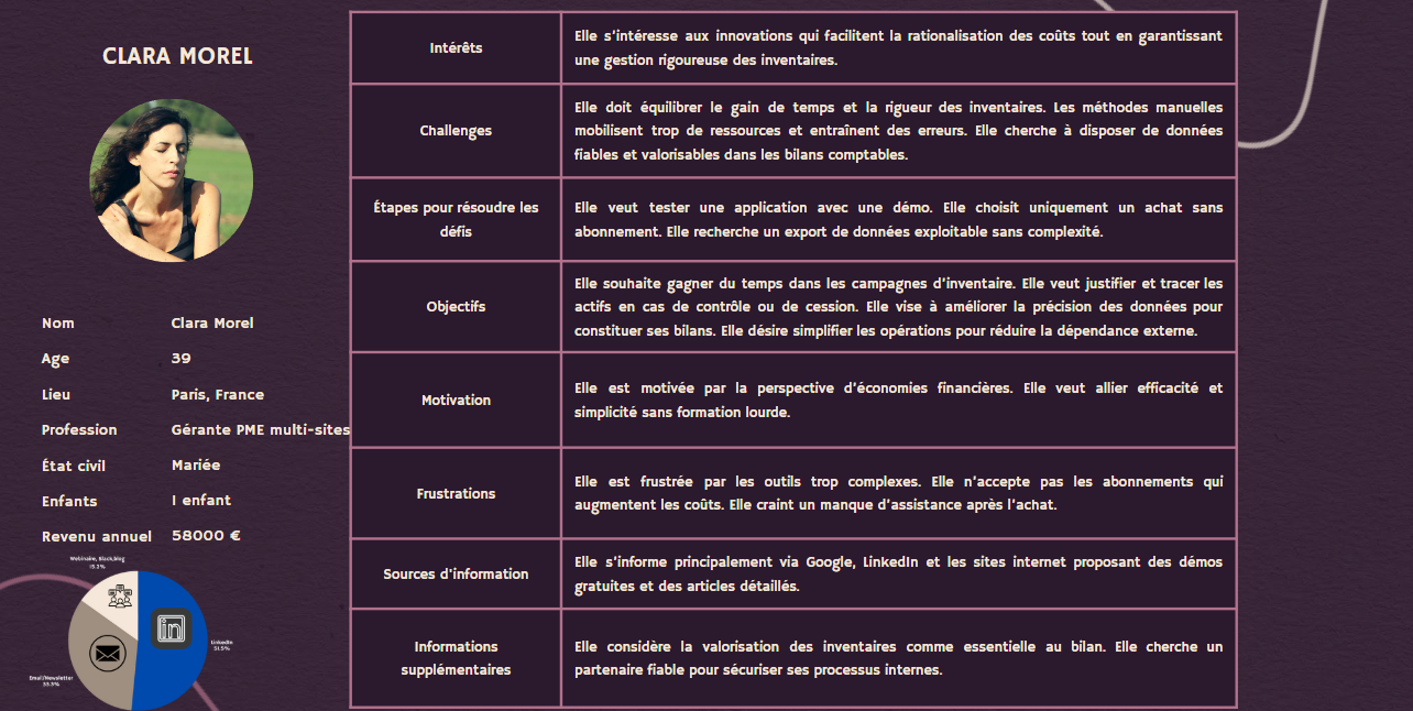 Clara Morel est gérante d'une PME avec plusieurs unités et dépôts. Elle doit gérer la fiabilité des inventaires en interne. Elle recherche des solutions simples, sans abonnement et adaptées aux contraintes budgétaires. Elle est attentive à la rigueur et à la traçabilité dans la gestion de ses actifs.